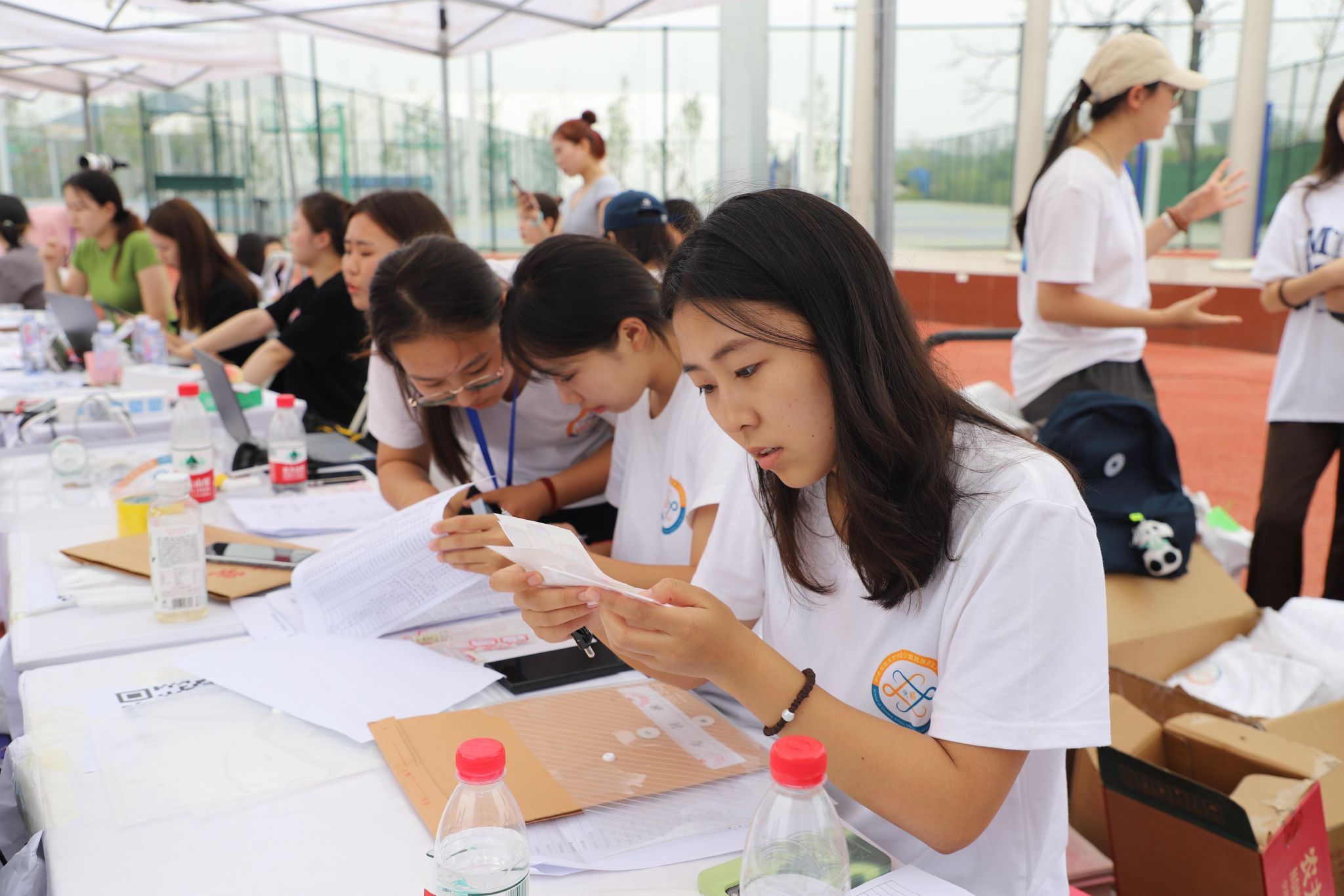 信息录入处,学姐在为萌新们办理入学手续、发放校园卡与开学大礼包等。
