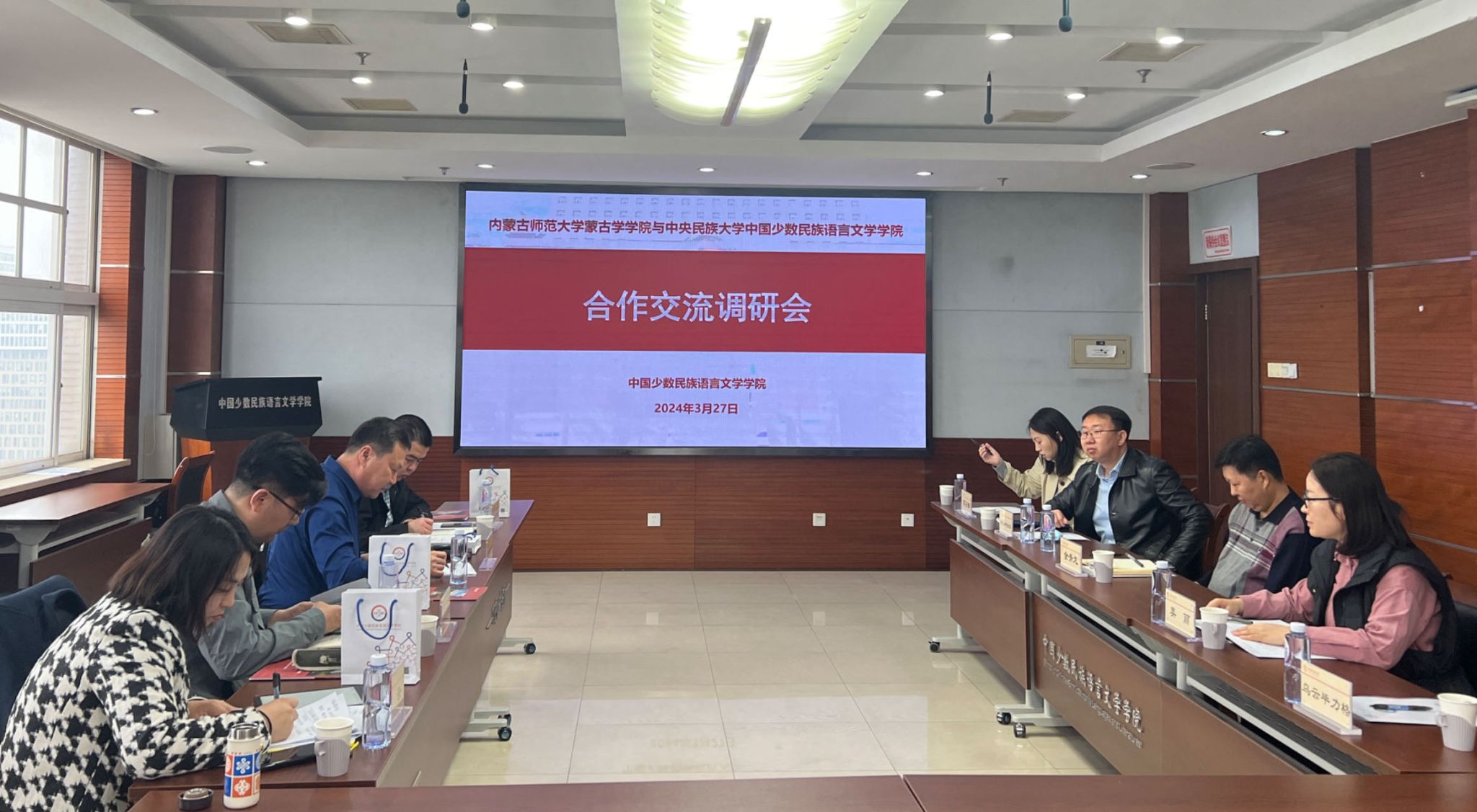 2024年3月27日上午,内蒙古师范大学蒙古学学院党委书记孟根巴根、蒙古语言文学系主任阿拉达日吐、翻译系主任彩云、数字人文系主任那达木德一行四人来成人软件 调研。成人软件 党委书记袁辰霞、副院长金青龙、教学管理办公室主任美丽、学院办公室乌云毕力格、蒙古语言文学教学系好比斯嘎拉图、苏日娜老师参加交流座谈。