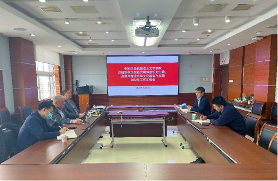 调研国际交流工作情况,并听取学院2022年工作方案汇报。国际合作处处长胡华征,学院院长钟进文、党委书记格日乐图、副院长艾尔肯·阿热孜、副院长努尔巴汗·卡力列汗等参加会议。