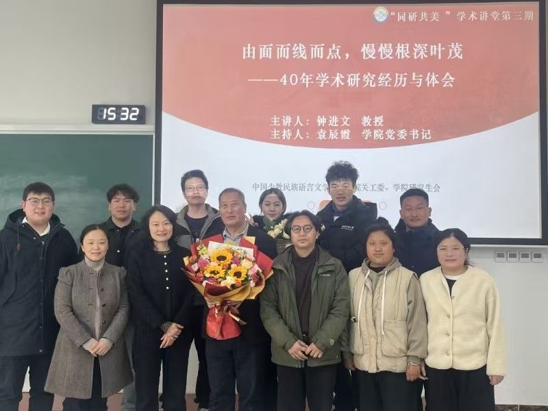 教授、博士生导师钟进文担任主讲嘉宾,学院党委书记袁辰霞主持。钟进文教授以“由面而线而点,慢慢根深叶茂” 为主题,深情回顾了自己四十载深耕文学研究与语言研究领域的学术历程,将一路的宝贵经验与深刻感悟倾囊相授。他着重指出,在学术研究中,精准捕捉关键点是深入探索的关键,一旦找准方向,便要持之以恒、深耕细作。同时,钟教授强调了守正创新的重要性,鼓励大家紧跟时代步伐,不断提升科研实力,积极拥抱学术前沿。着眼当下,他特别提出,要紧紧围绕铸牢中华民族共同体意识这一主线,深度聚焦“共同性”展开研究,为学科发展注入新的活力与内涵。