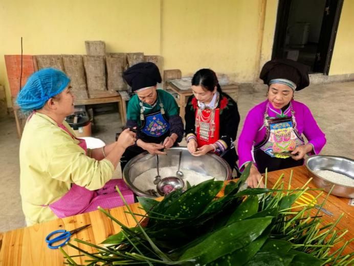 邓玉鲜(右二)与文艺队孃孃学包粽子过端午