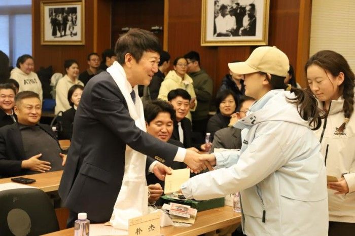 朴杰董事长在讲话中向获奖师生表示热烈祝贺。他回顾“朴杰奖学金”设立以来的十年历程,并结合自身经历分享感悟,鼓励同学们无论身处何种境遇,都要保持对知识的渴望、对梦想的执着,把暂时的困难当作成长的阶梯,未来用所学本领回馈社会,让爱心传递下去。